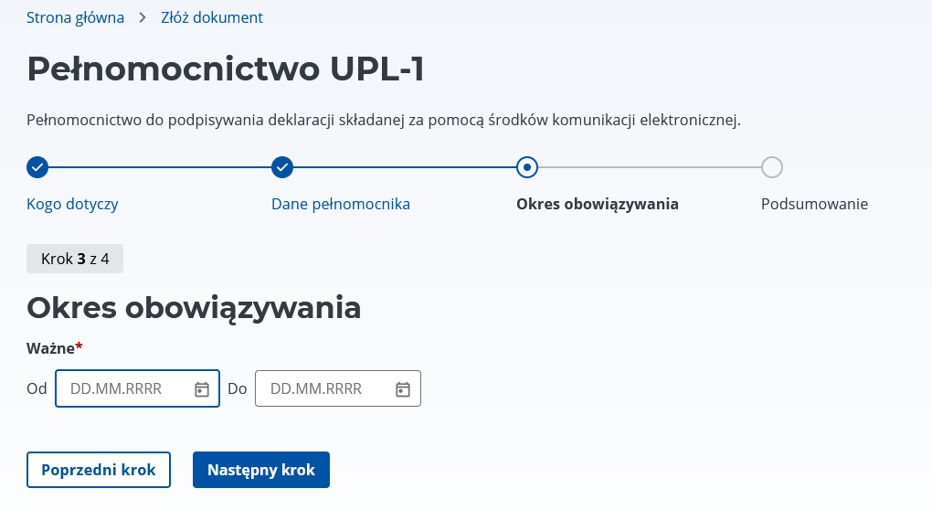 Po uzupełnieniu tych danych przejdź do następnego kroku, w którym wskażesz okres obowiązywania pełnomocnictwa. Pole „do” może pozostać puste – w takim przypadku pełnomocnictwo będzie ważne bezterminowo (do czasu jego odwołania).