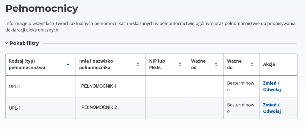 Po prawidłowym przetworzeniu danych zawartych w pełnomocnictwie, lista pełnomocników będzie widoczna w zakładce „Pełnomocnicy” – z tego poziomu możesz zmienić bądź odwołać wskazanego pełnomocnika.