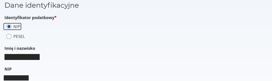 W pierwszym kroku zaznacz, że składasz pełnomocnictwo za siebie oraz wybierz identyfikator podatkowy „NIP”.