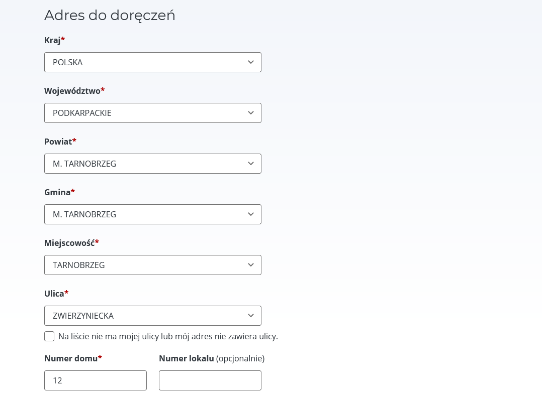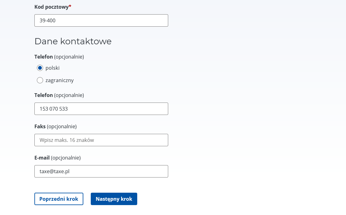 Na podstawie rejestru CEIDG, system automatycznie uzupełni dane adresowe. Sprawdź, czy są poprawne.
