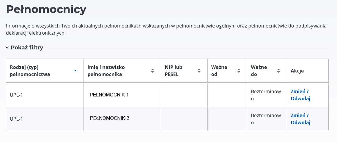 Po prawidłowym przetworzeniu danych zawartych w pełnomocnictwie, lista pełnomocników będzie widoczna w zakładce „Pełnomocnicy” – z tego poziomu możesz zmienić bądź odwołać wskazanego pełnomocnika.